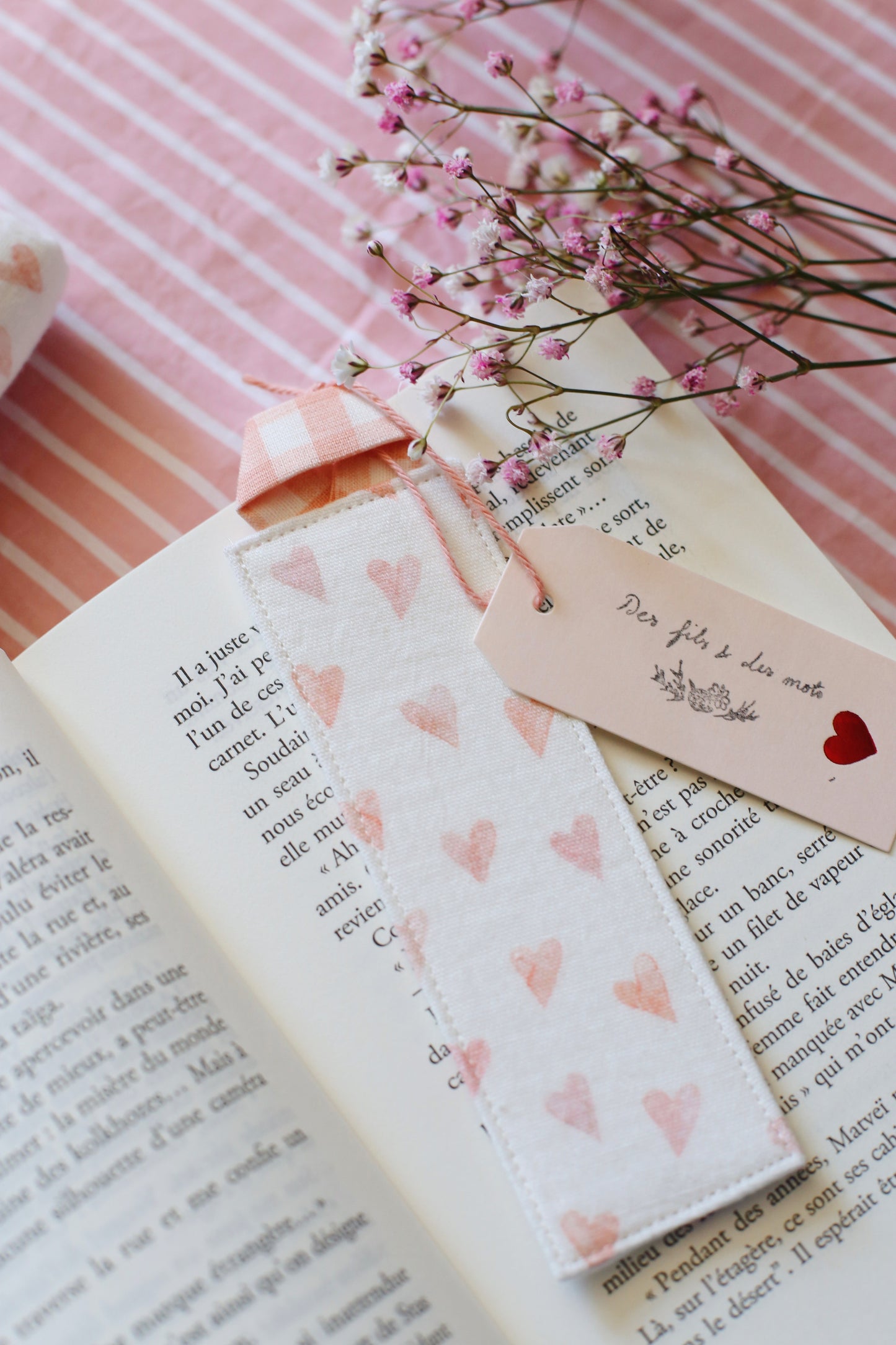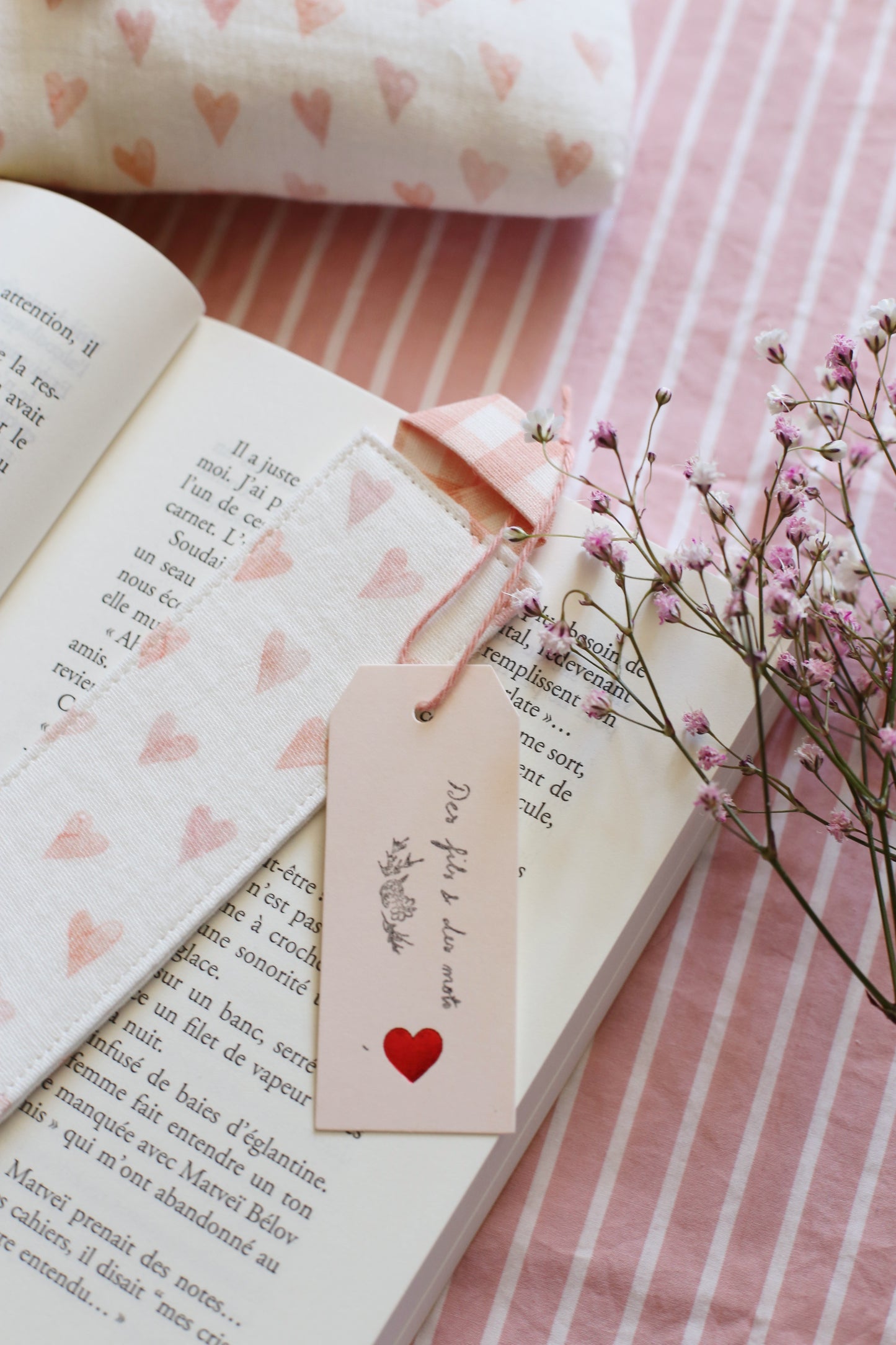 Bookmark made with certified organic cotton fabric. Insert in powder pink gingham, Oeko-Tex certified. Paper made in France with a fairly rigid weight is sewn inside for better support.
