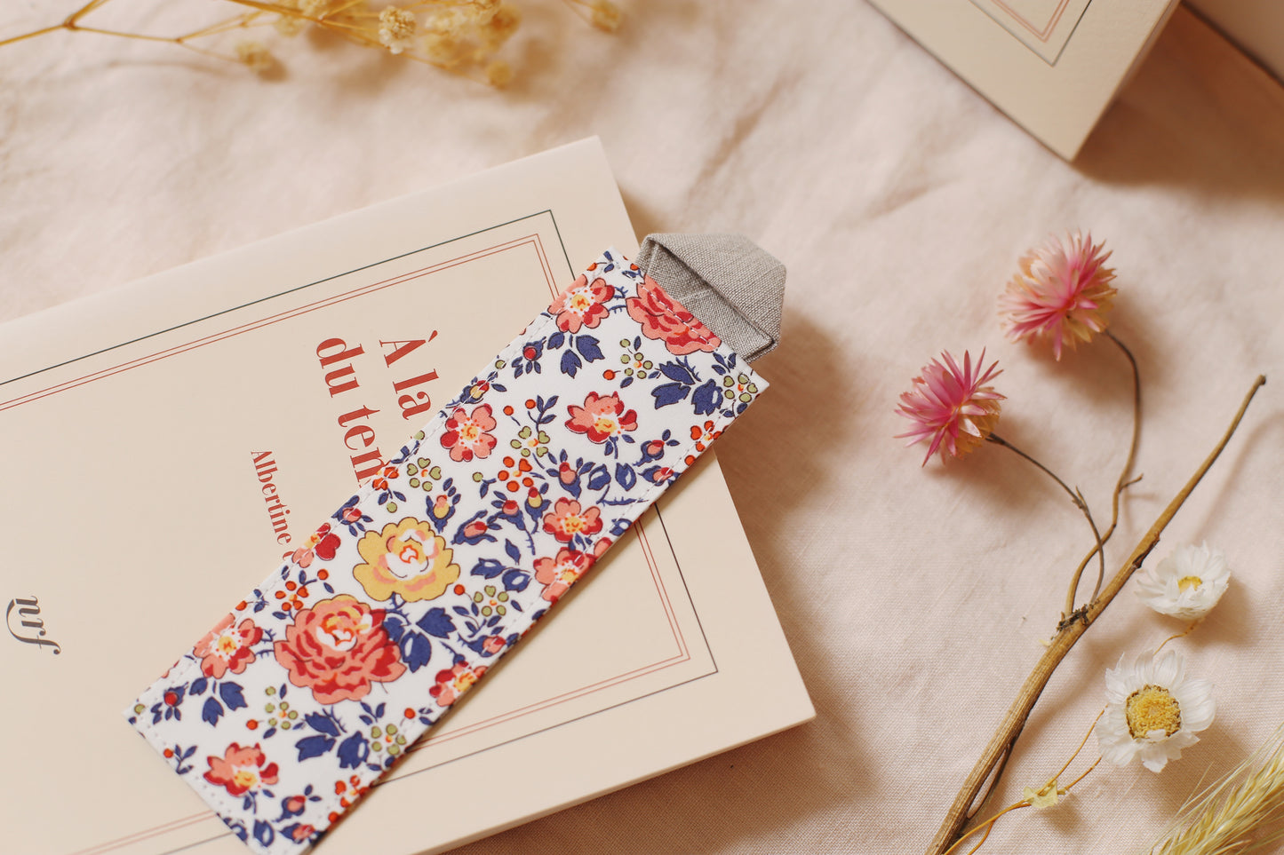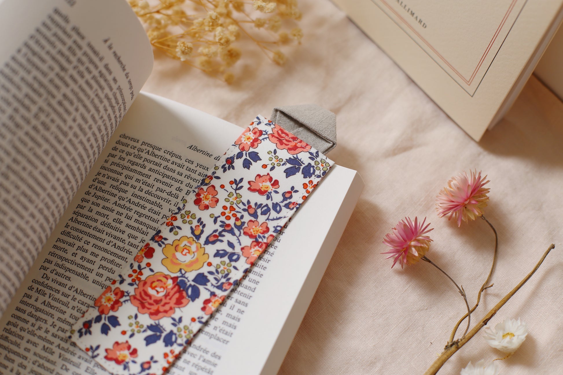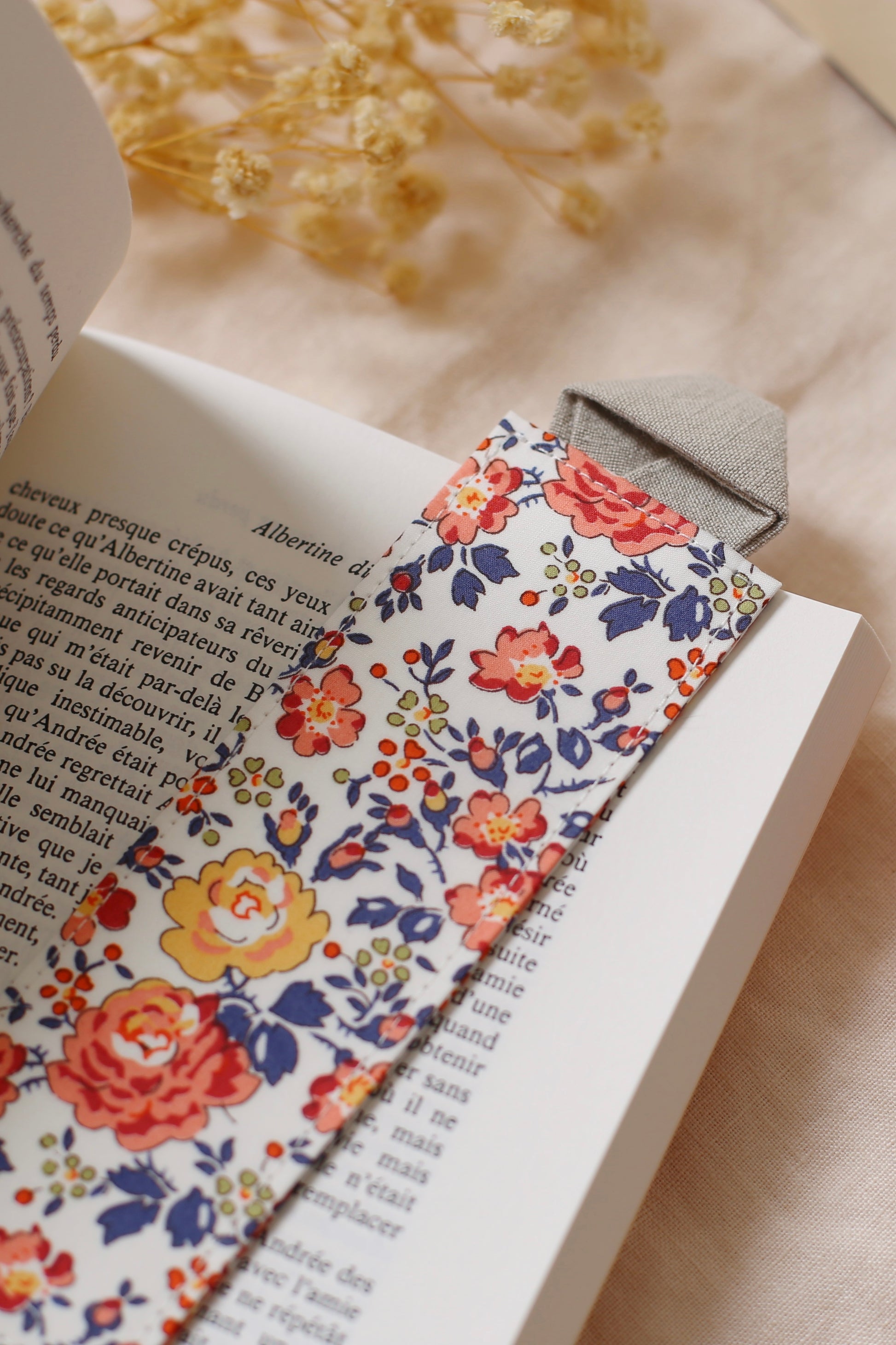 Bookmark made with Liberty London cotton fabric, Oeko-Tex certified, and manufactured in Europe. A fairly rigid paper made in France is sewn inside for better support.